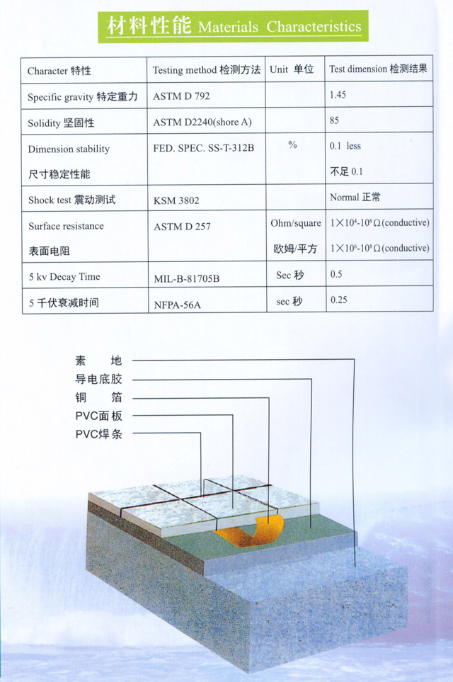 5.永久導電性能 Permanent conductivity 導體材料平均分布于整塊地板磚,使其具有永久導電性能 Conductive material is distributed evenly in entire tile so that if has permanent conductivity.